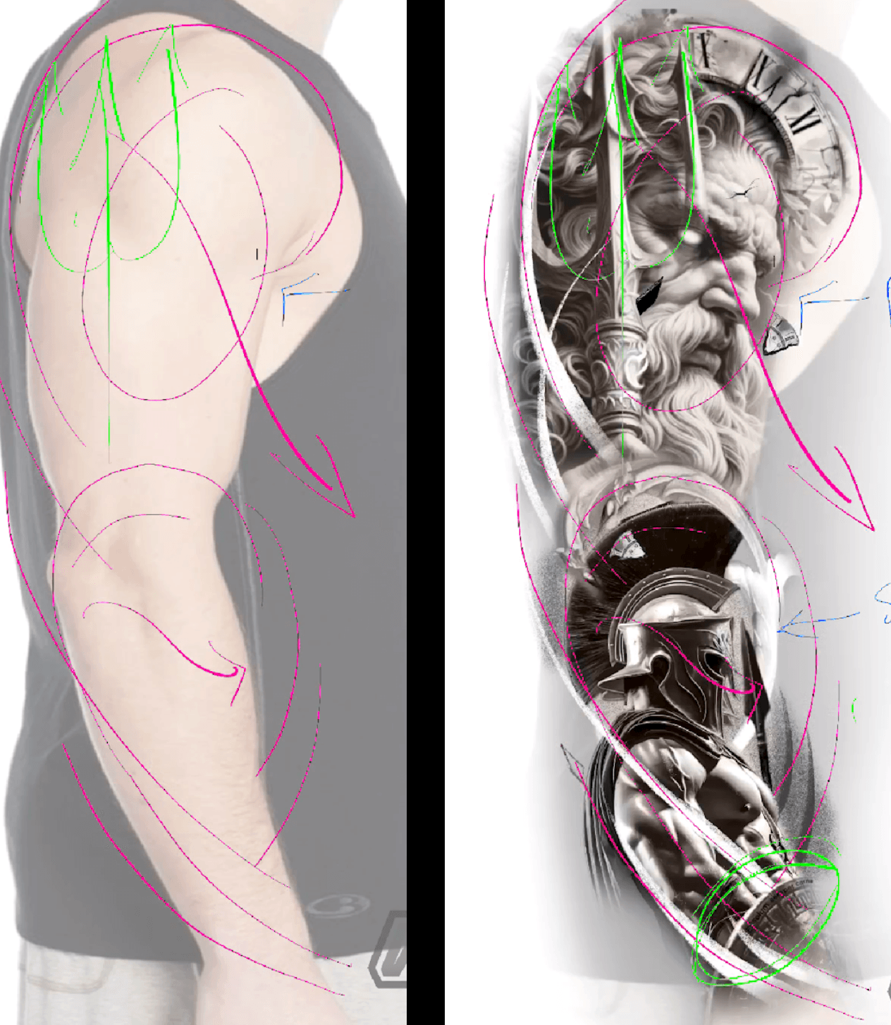 Una guía donde verás como fluye cada parte del cuerpo para poder ubicar tus diseños de manera estratégica, en un formato que puedes tener a la mano siempre para guiarte antes de diseñar cada tatuaje.